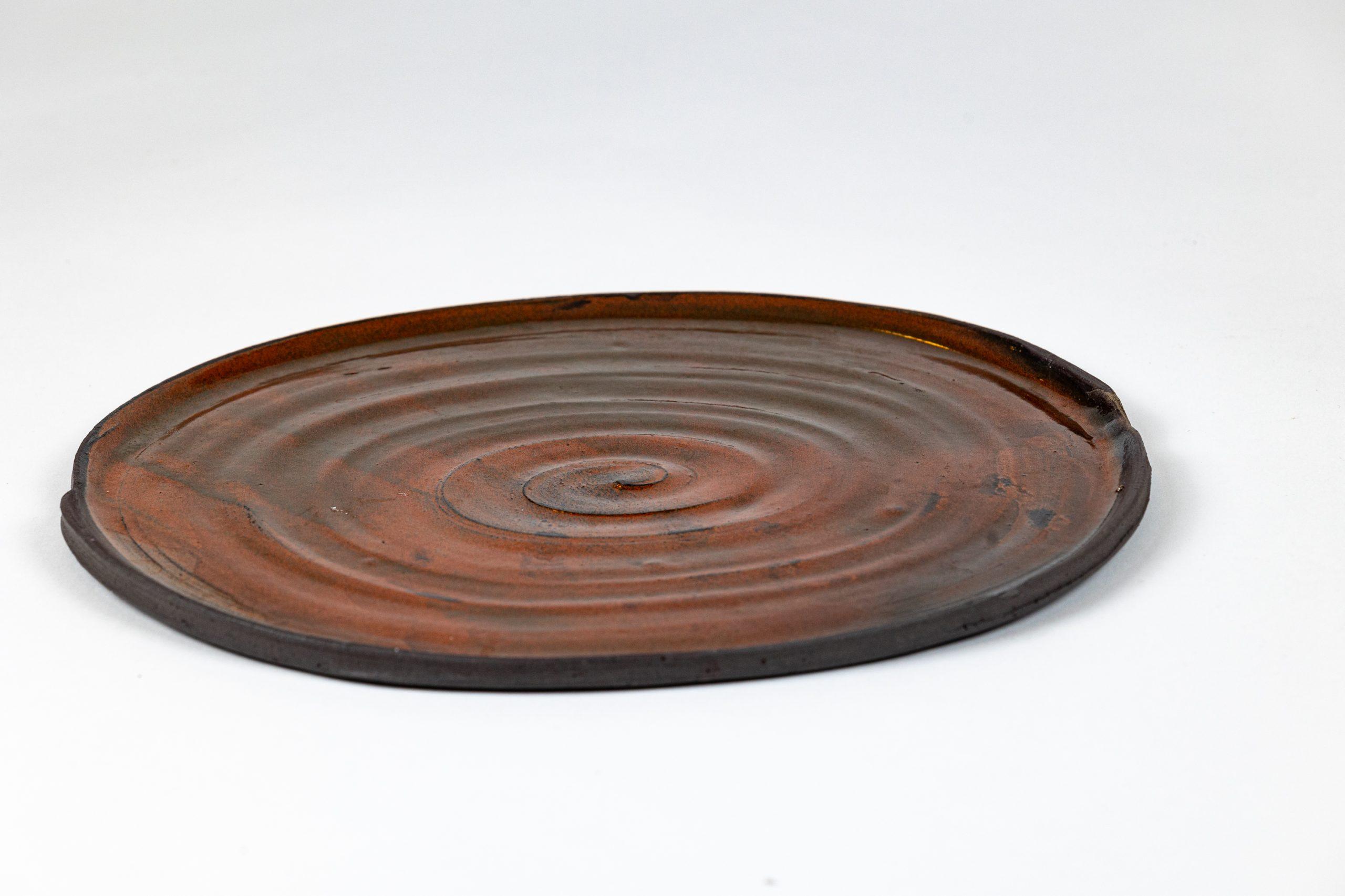 מגש קרמיקה עגול בעבודת יד בגוון אדמה עם טקסטורה ספירלית רכה במרכז.