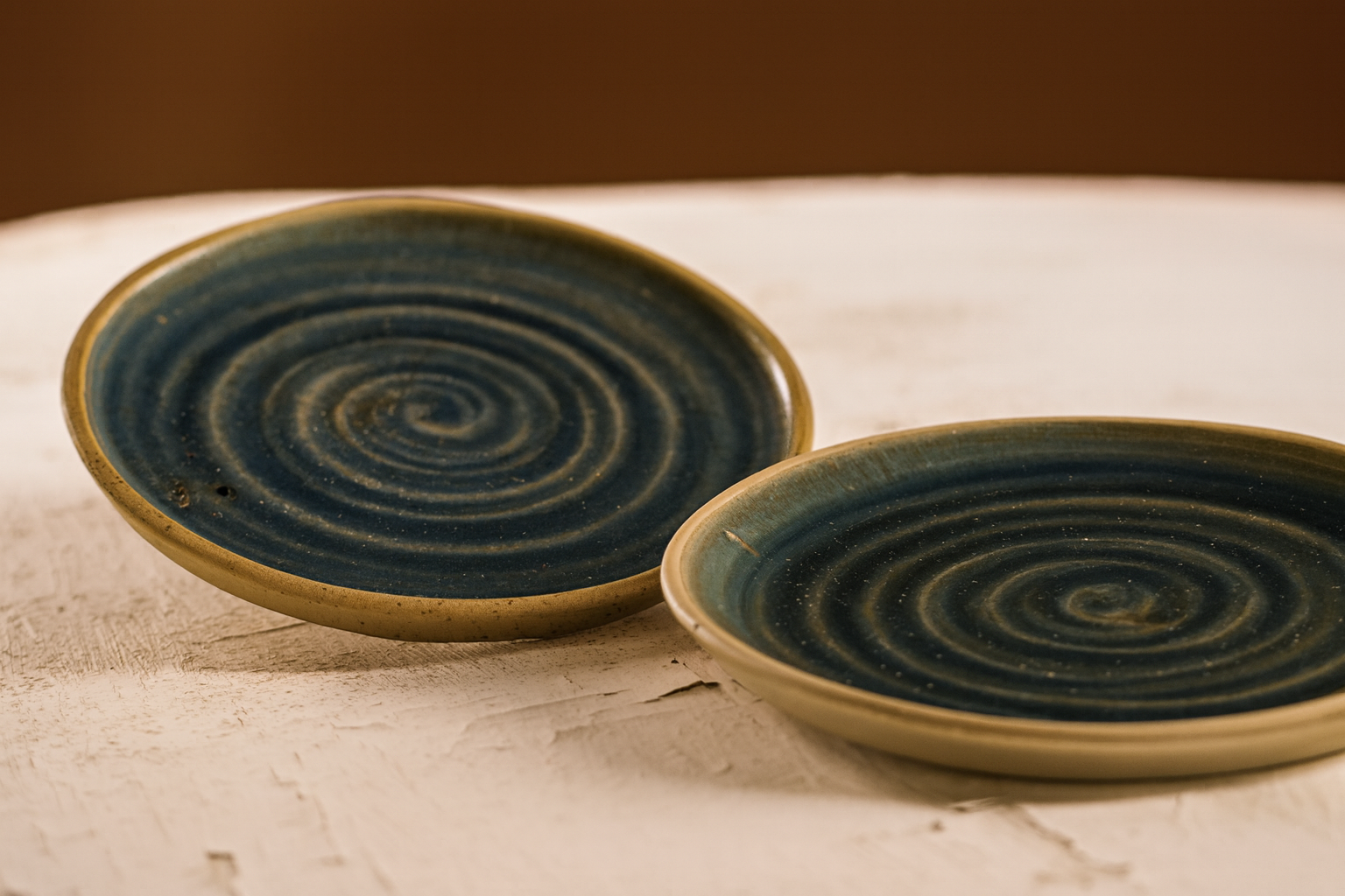 צלחת קרמיקה בעבודת יד בגוון כחול־ים עמוק עם טקסטורה ספירלית עדינה.